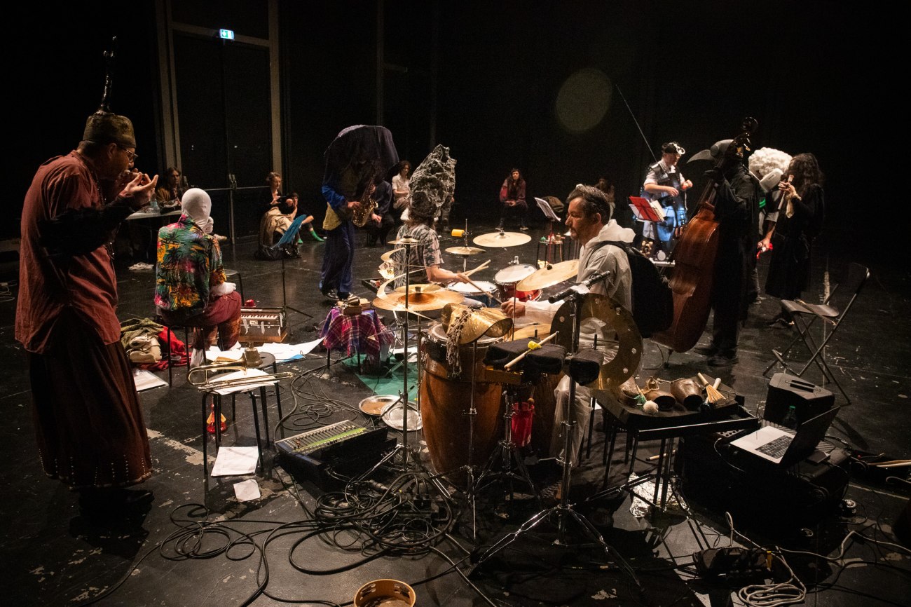 The project was in residence at 104 Paris in early March. The artists were able to continue working on their costumes as “second skins,” all within a musical universe of revelrous noise. Get a sneak peek at the costumes currently in production!